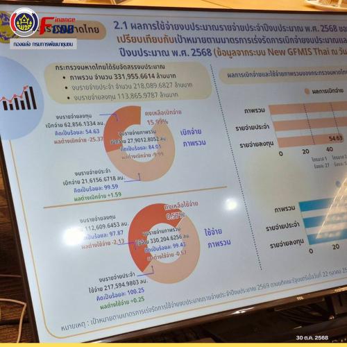 โดยนายเสฏฐชัย ยุทธเศรษฐสิริ ได้กล่าวรายงานผลการเบิกจ่ายและการใช้จ่ายงบประมาณของกรมการพัฒนาชุมชน ณ วันที่ 24 ตุลาคม 2568 และกำหนดแผนการเร่งรัดการใช้จ่ายงบประมาณรายจ่ายประจำปีงบประมาณ พ.ศ. 2569 ของกรมการพัฒนาชุมชน ให้เป็นไปตามมาตรการเร่งรัดการเบิกจ่ายงบประมาณรายจ่ายประจำปีงบประมาณ พ.ศ. 2569 ตามมติคณะรัฐมนตรีเมื่อวันที่ 21 ตุลาคม 2568