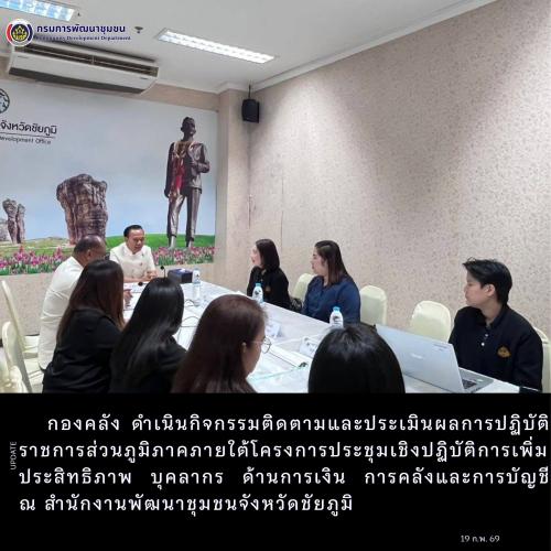 นางอารยา ชลประคอง นักวิชาการเงินและบัญชีชำนาญการพิเศษ รักษาราชการแทนผู้อำนวยการกองคลัง มอบหมายให้ นางสาวสิรพัชร คงโนนกอก นักวิชาการเงินและบัญชีชำนาญการพิเศษ นางสาวเมวิกา เหมือนสี เจ้าพนักงานการเงินและบัญชีชำนาญงาน และนางสาวกัญญาภัค เกสะวัฒนะ เจ้าพนักงานการเงินและบัญชีชำนาญงาน ดำเนินกิจกรรม ติดตามและประเมินผลการปฏิบัติราชการส่วนภูมิภาค ภายใต้โครงการประชุมเชิงปฏิบัติการเพิ่มประสิทธิภาพบุคลากร ด้านการเงิน การคลัง และการบัญชี ณ สำนักงานพัฒนาชุมชนจังหวัดชัยภูมิ